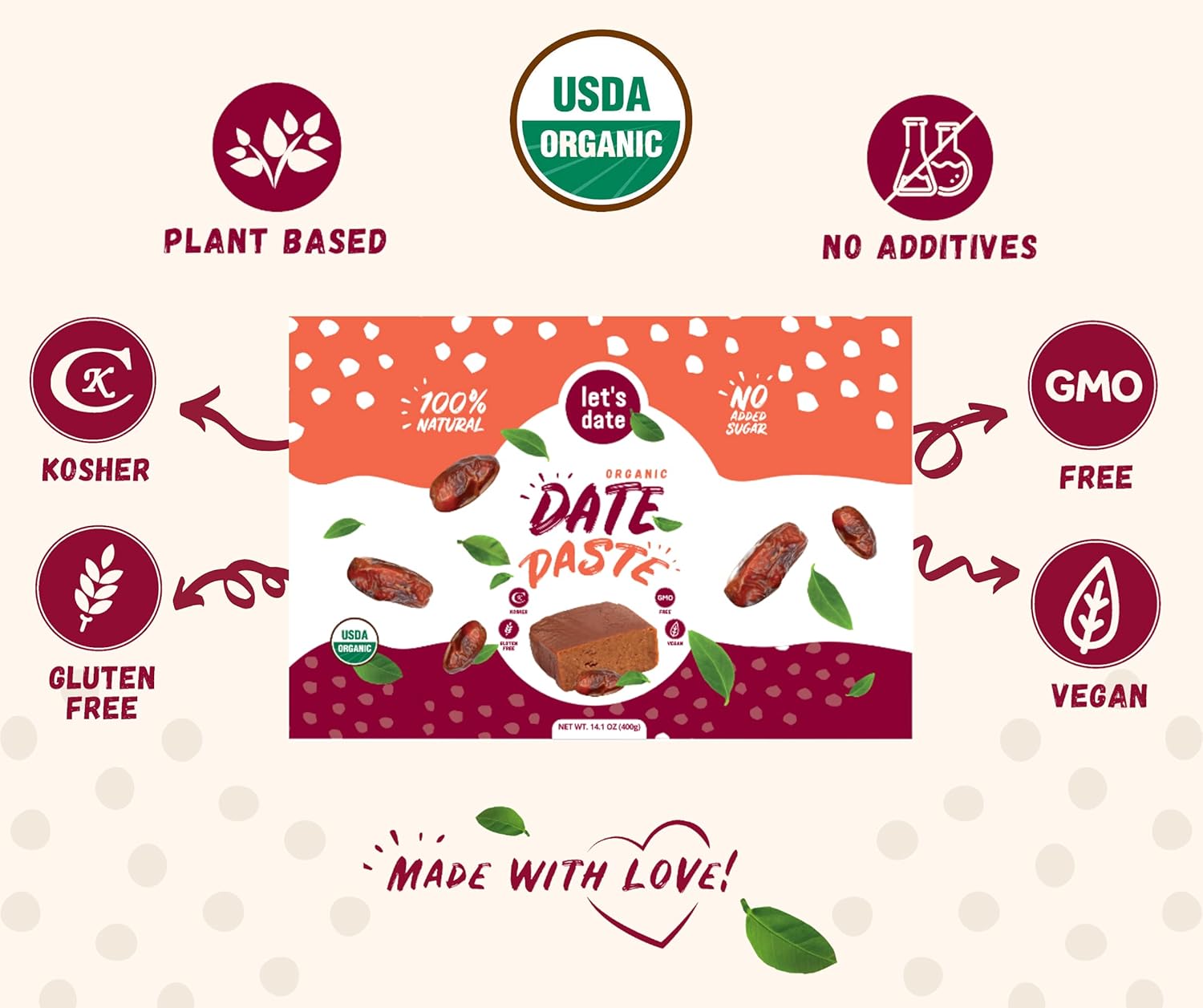 Made from 100% organic dates which are ground to a homogenous and smooth brown color paste, Let's Date organic date paste is the perfect sweet addition to any “no added sugar” recipe. Filled with vital nutrients, it's a great way to make a healthy choice without sacrificing taste Let’s Date Story: At Let’s Date, we believe in global wellness, and we strive to contribute towards achieving just that by providing tasty, vitality-boosting foods critical to human bodies of every kind, everywhere! Founded in love, Let’s Date is a health-conscious brand developed to provide nutrition-lovers, all over the globe, the opportunity to fall in love with the taste, the texture, and the utility of carefully selected dates and minimally-processed date products. Let’s Date offers healthy sugar substitutes made of 100% natural dates which are organic, kosher, paleo, vegan and gluten-free, so they meet the strict criteria to fit many selective diets.We’re proud of the products we offer, and we’re equally proud of the reasons we do so. On top of that, our products are delightfully delicious, so much so that we can’t help but share. So, Let's Date ❤
