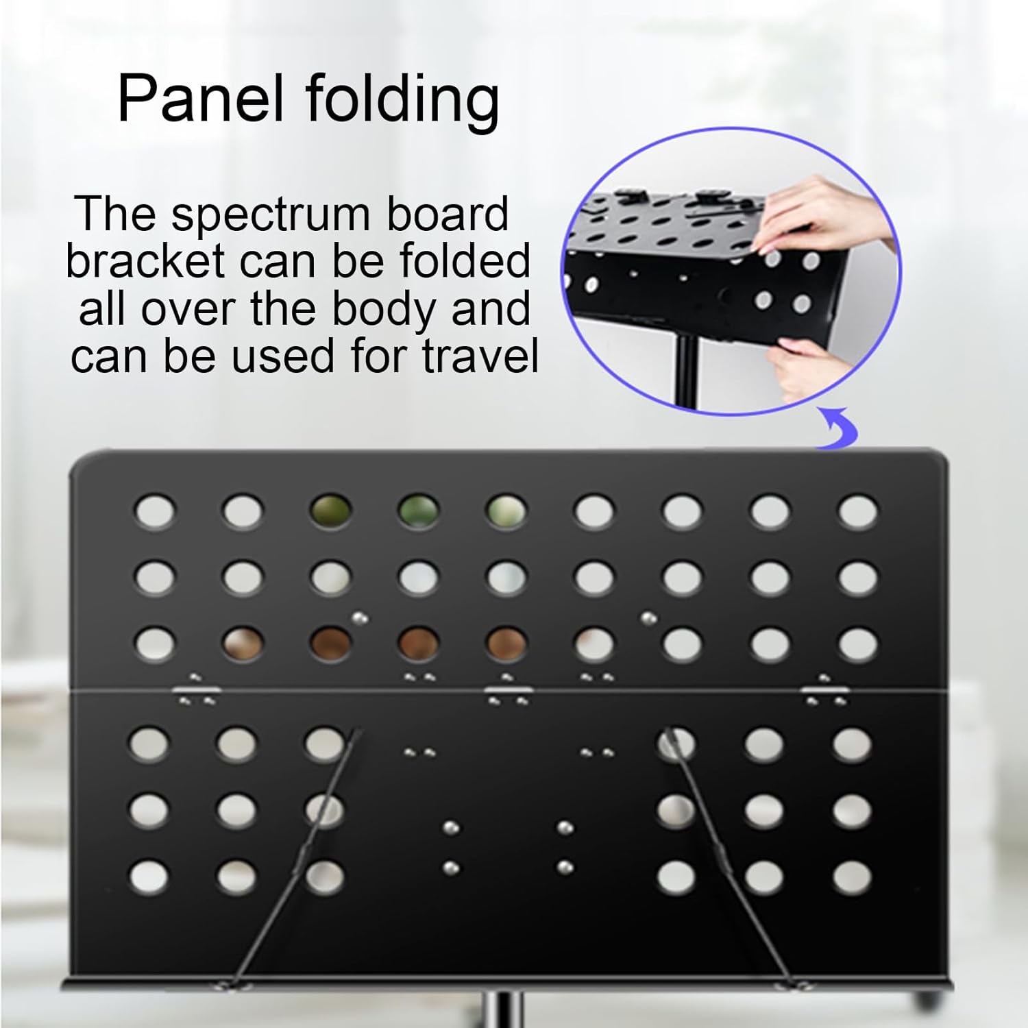Product name: Music stand Color: Black Height adjustable: 1-1.7m Packing list: Music stand ×1 The whole body of this music stand adopts a clever folding structure, which is not only easy to store, but also greatly reduces the carrying burden. The panel and bracket part are made of thickened metal material, which improves the overall bearing capacity and can stably carry 4KG weight.